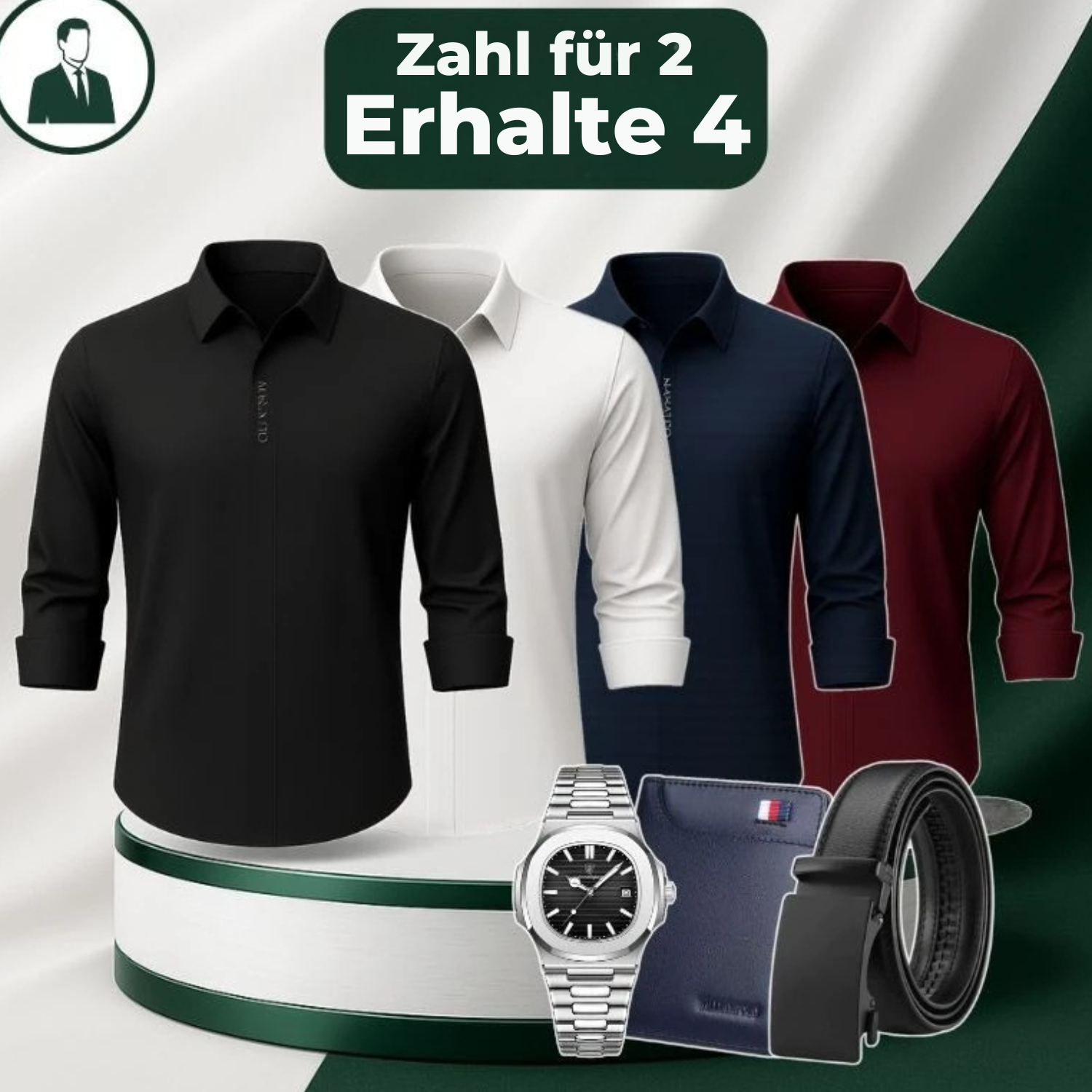Zahl 2, nimm 4 – Set aus technologischen Makatto-Hemden aus Eisseidenjersey (knitterfrei!) + GRATIS: Gürtel, Geldbörse und Uhr